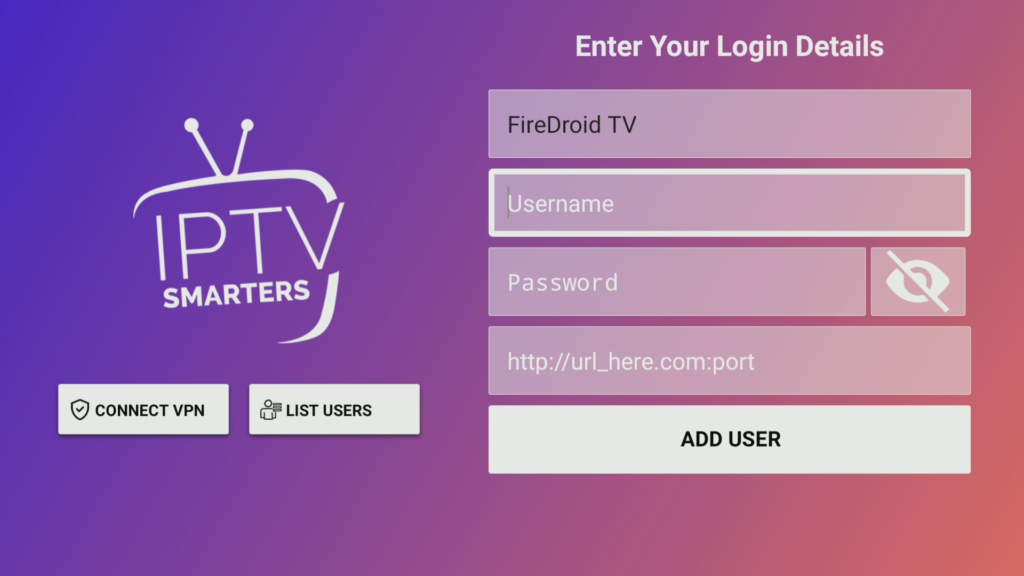 - Enter your IPTV service details: Server URL, Username, Password